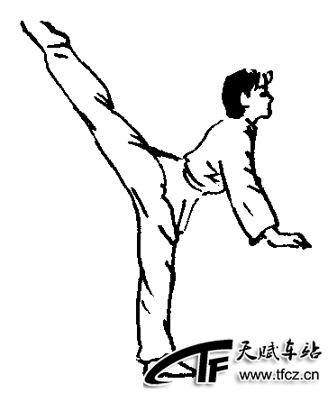 直摆性腿法。两手扶肋木或一定高度的物体,一腿支撑,另一腿脚面绷平向后倒踢,上体前俯、挺胸、抬头,踢腿时两腿绷直,支撑腿全脚着地。先踢一腿,然后再换另一腿。(图2—4—13)此腿法可以拉长大腿部的肌肉,增强腿部的柔韧性。