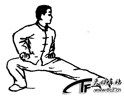 太极拳的步型之一。在各种太极拳套路中仆步出现的次数较少。主要在各种下势动作中应用。动作规格:一腿全蹲,膝与脚尖稍外展,全脚掌着地;另一腿自然伸直平铺,脚尖内扣,全脚掌着地。(图2—4—26)动作要领:做仆步时要做到:①上体不能过分前倾。②支撑腿大小腿靠紧,臀部接近小腿,不能撅起。注意事项:老年人做仆步时,如下蹲有困难可半蹲。练习时,也可先将屈蹲腿脚跟提起,然后再下蹲将脚跟放平。