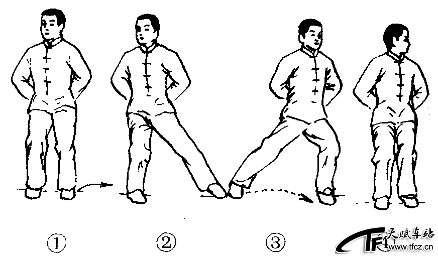 太极拳步法之一。为两腿依次横向平移的动作。各式太极拳的侧行步虽然动作不尽相同,但要求基本一致,并多配合云手动作进行。动作过程:(以左侧行步为例)①两腿屈膝下蹲(图2—4—30—①),重心移至右腿,左脚向左侧横向迈出一步,前脚掌着地(图2—4—30—②)。②左脚垂直落地踏实,重心移至左腿,同时上体稍左转(图2—4—30—③)。③右脚抬起移至左脚右侧,与左脚平行落地、踏实(图2—4—30—④)。动作要领:做侧行步时要做到:①上体正直,伴随着重心的移动,上体左右拧转。②两脚迈出和跟进时,脚掌先着地,然后移动重心,全脚踏实。③沿直线侧行。④两脚并步时脚尖向前,两脚间距 ......