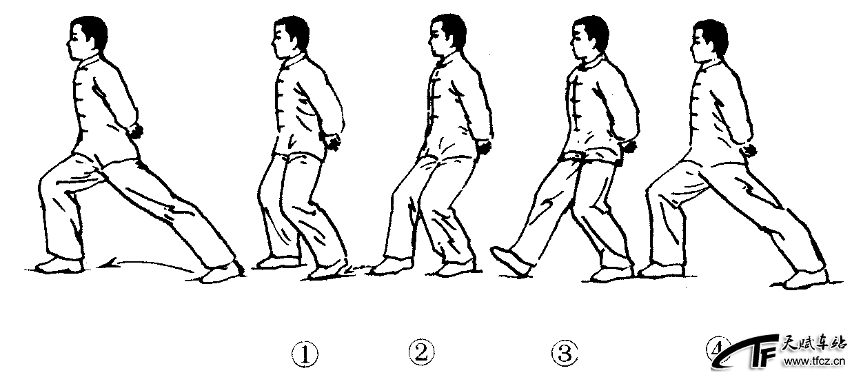太极拳步法之一。为后脚向前跟进的动作。孙氏太极拳套路中跟步动作较多。动作过程:①从右弓步开始,重心前移至右腿,左腿抬起,向前跟进半步,前脚掌着地(图2—4—31—①)。②左脚踏实,重心移左腿(图2—4—31—②)。右脚向前迈出一步,脚跟先着地(图2—4—31—③)。重心前移,右脚踏实,成右弓步(图2—4—31—④)。动作要领:①上体中正,不可前俯后仰。②后脚跟进,要根据后接动作的要求,放置适当的位置。注意事项:①做跟步时要注意重心的转换。②后脚也可跟进一步,这种跟步主要见于孙氏太极拳。③“跟步”是太极拳基本步法之一,老年初学者应反复练习熟练掌握。