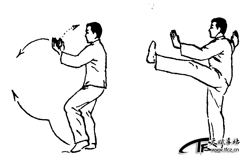 太极拳腿法之一。是以脚跟为力点的屈伸性腿法。蹬脚是太极拳七种主要腿法之一。在各种太极拳套路中一般都有蹬脚。动作过程:(以左蹬脚为例)右腿微屈站稳,左腿屈膝提起,然后缓慢地向前方或前侧方蹬出;两手成掌抱于胸前,分脚的同时,两掌内旋,向左右弧形撑开,与肩同高,左掌与左脚在同一方向。(图2—4—32)动作要领:蹬脚时要做到:①上体中正自然。②用力沉实,缓慢蹬出,力达脚跟。③在腿蹬出后,腿要伸直,脚尖上勾,脚要高过腰部。攻防含义:蹬脚主要用于蹬击对方的头和上体。注意事项:①蹬脚时一般伴随有双手分开的动作。②注意:“蹬脚”与“分脚”的区别(见分脚)。 ......