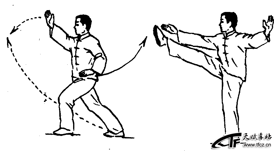 太极拳腿法之一。是一种崩脚直线上摆的击拍性腿法。各式太极拳中都有拍脚动作。拍脚是太极拳七种主要腿法之一,在各种太极拳套路中是出现次数最多的腿法。动作过程:(以右拍脚为例)左腿微屈站稳,右腿脚面展平向上直摆,用右手击拍脚面,左手向上弧形抬起,至肩高。(图2—4—34)动作要领:做拍脚时,要做到:①发力迅速。②在额前击拍,击拍要准确响亮。③脚面展平上摆。④击拍时腿自然伸直。攻防含义:拍脚是用脚面踢击对方的下额或手臂等部位。注意事项:①吴式、孙式太极拳的拍脚是用异侧手击拍脚面。②老年人做拍脚时上体要稍前倾。③老年人做拍脚时手可不拍脚,用手拍大 ......