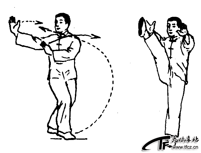 太极拳腿法之一。是一种弧形直摆击响性腿法。各式太极拳中都有摆莲脚动作。摆莲脚是太极拳七种主要腿法之一,在各种太极拳套路中是出现次数最多的腿法。动作过程:(以右摆莲脚为例)左腿微屈站稳。右腿从左侧摆起经面前向右做扇形摆动,两手在额前依次迎拍脚面。(图2—4—35)动作要领:做摆莲脚时要做到:①以大腿带小腿,力达脚面。②击拍时,脚面展开,腿自然伸直。③击拍要准确、响亮(两响)。④击拍高度为面额前方。攻防含义:摆莲脚是用腿、脚横击对方。其特点是攻击面大,力量重。注意事项:①做摆莲脚时,上体稍前倾,不可左右摇摆。②有时做摆莲脚伴随着身体转动,支撑腿 ......