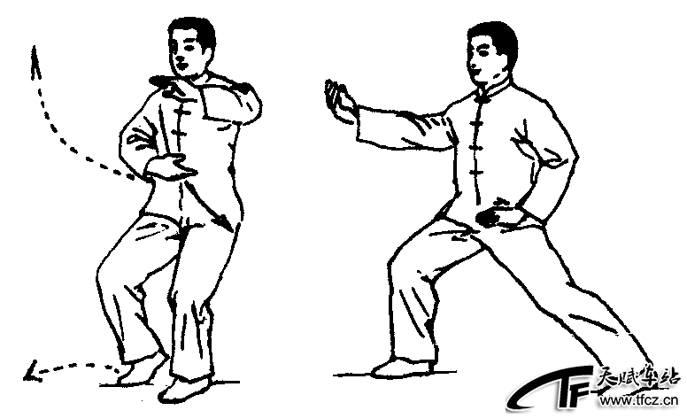 太极拳动作之一。在各种太极拳套路中,野马分鬃是出现次数较多的动作。陈式、杨式、武式太极拳中都有此动作,其动作和要求大同小异。动作过程:(以右野马分鬃为例):①从抱球开始。(图2—4—37—①)②上体微右转,右脚向右侧前方迈出一步,脚跟先着地,然后重心前移,右脚踏实成右弓步,同时随着转体左手下按于左胯侧前方,手心向下、指尖向前;右手向右前上方弧形横出,高与眼平,掌心斜向上,眼看右掌。(图2—4—37—②)动作要领:①上体中正,以腰带臂旋转。②两手始终成弧形。③随着蹬直后腿,脚后跟外展。④野马分鬃的弓步横向距离较宽,大约30厘米,两脚间夹角45°~60°。⑤弓 ......