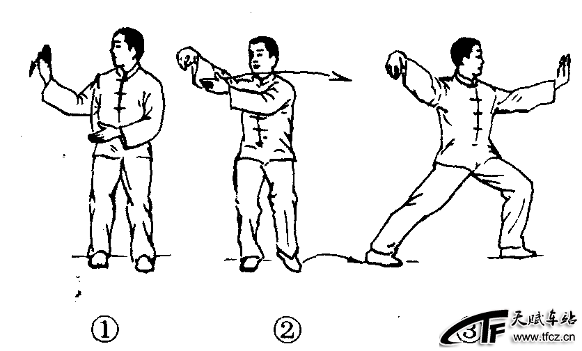 太极拳动作之一。在各种太极拳套路中都有“单鞭”,并且是出现次数较多的动作之一。各式太极拳中的“单鞭”其动作大同小异。动作过程:①由图2—4—41—①开始。②重心右移至右腿,左脚跟提起;同时左手上提至右肘旁;右臂内旋,右手成勾。(图2—4—41—②)③身体稍左转,左脚向左侧迈出一步,脚跟先着地,然后重心前移,左脚踏实,成左弓步;重心前移的同时,身体左转,左掌随转体慢慢翻掌,并向前推出,手指与眼同高,目视左手。(图2—4—41—③)动作要领:①上体正直,两肩下沉,两肘下垂,头要上顶,胸要内含。②两臂微屈成弧形,不可僵直。③左肘与左膝上下相对。④转体与推掌协 ......