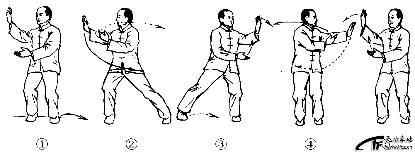 太极拳动作之一。云手是各种太极拳套路中出现次数最多的动作之一。各式太极拳中都有此动作,只是武式太极拳中称“纭手”,陈式太极拳中称“运手”,其动作大同小异,云手多接于单鞭之后。动作过程(以向左云手为例):①姿势开始。(图2—4—42—①)②上体右转,重心右移至右腿,左脚向左侧横跨一步,脚尖向前;右臂内旋弧形下落,掌心斜向外,左掌向上提起至肩高,掌心斜向内。(图2—4—42—②)③上体左转,重心左移,左掌经面前向左划弧云转,右掌向下经腹前划弧向左云转,目随左掌。(图2—4—42—③)④上体继续左转,右脚收于左脚内侧落地,两脚平行相距10~20厘米;两掌云至身体左侧 ......