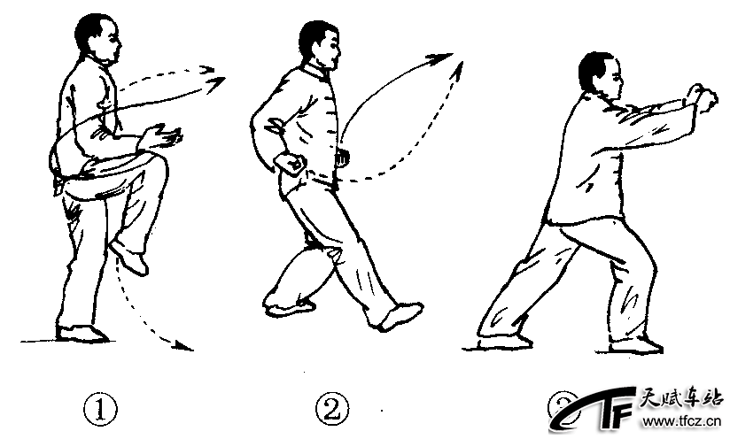 太极拳动作之一。此动作多接于“蹬脚”、“分脚”动作之后。动作过程:①左腿自然站立,右腿屈膝提起,两臂微屈外旋,手心向上,弧形落于右膝上方,目视前方。(图2—④—44—①)②左腿屈膝下蹲,右脚向前落步,脚跟着地,两掌弧形下落回收于腰侧,并逐渐握拳。(图2—4—44—②)③重心前移,右脚踏实成右弓步,两拳经两侧向前上方弧形贯打,高与耳齐,相距头宽,两拳眼斜向下,两臂半屈成钳形。(图2—4—44—③)动作要领:头颈正直,松腰、松胯、沉肩、垂肘,两肘不可扬起。攻防含义:对方双手攻来时,先将其两手下压化解开,再用双拳贯击对方两耳。此式也因其用法而得名。注意事 ......
