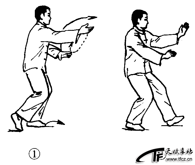 太极拳动作之一。又称“手挥琵琶式”。各式太极拳中的动作要求基本相同。动作过程:①左脚支撑重心,身体微左转,右脚提起跟进半步,前脚掌着地同时左手置于胯前,右手平举于体前,右肩微向前探出。(图2—4—51—①)②右脚踏实,重心后移至右腿,左脚稍向前上步,脚跟着地,膝微屈成左虚步;同时右掌随腰部微右转,屈肘回带,掌心向下,左掌向外、向前上方划弧挑掌,然后两臂松沉、内含,左掌成侧立掌停于胸前,掌心与左肘相对。(图2—4—51—②)动作要领:①上体正直,以腰部转动带动右臂回带。②前臂保持弧形。③两手心要前后遥对如抱琵琶状。攻防含义:当对方右手攻来时,右手 ......