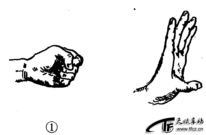 指练习形意拳时手的姿势。其手型主要有:①螺形拳:五指卷屈握紧,拇指压于食指和中指的第二指节上,拳面成斜坡呈螺形。(图2—4—60—①)成螺形拳时,拳眼向上称立拳;拳心向上称仰拳;拳背向上称俯拳。②圆形掌(又称形意掌):五指分开,指尖微屈,拇指向外展,食指上挑使虎口撑圆,其余三指微外撑,掌心内含。(图2—4—60—②)成圆形掌时,掌指向上称立掌;掌心向下称俯掌;掌心向上称仰掌。另外,形意拳的手型还有八字掌、剑指掌、刁勾等。