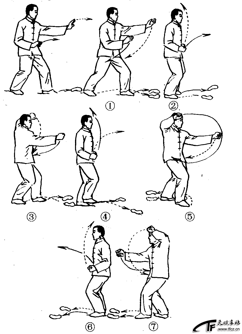 形意五行拳之一。为左右斜向前进,一架一冲的动作。炮拳是形意拳的主要拳法。古拳谱中载有“炮拳暴发最烈,故属火,养心血”之说,拳势较刚劲。动作过程:由三体式开始。右炮拳:左脚向前直进半步,同时右掌屈臂前伸,至与左手臂平齐,双手掌心向前下方。(图2-4-67-①)上动不停,右脚经左脚内侧向前迈一步,左脚随之跟进,悬靠于右脚内侧踝关节处;同时双臂外旋,屈肘回收,双掌变拳收至肚脐两侧;目视前方。(图2—4—67—②)右脚蹬地,左脚向左前方上一大步,右腿随之跟进半步成三体式步,同时上体向左拧转,左拳经胸前、面前向上钻翻并内旋小臂使拳心向外置于头部左侧;右拳随之向 ......