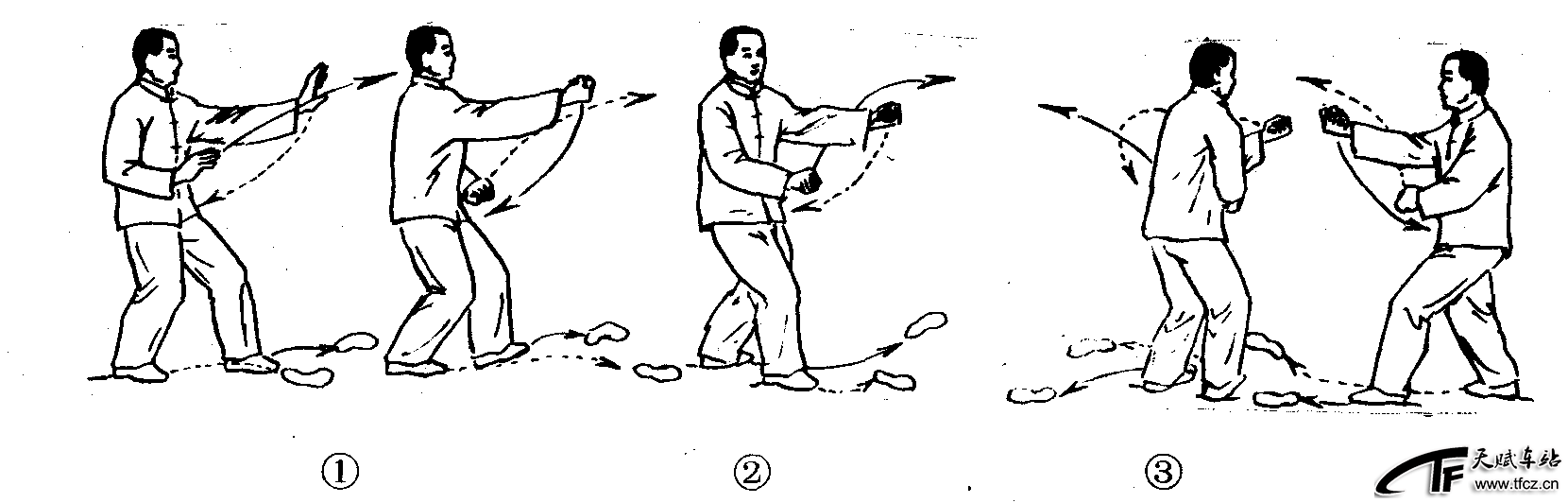 形意五行拳之一。为左右斜向前进,拳向斜前方弧形打出的动作。横拳是形意拳的主要拳法。古拳谱中载有“横拳形圆性实,其气顺则五行和……”之说。动作过程:由三体式开始。右横拳:两掌变拳握紧,然后左脚向左前方斜进一步,右脚随之跟进半步,成三体式步;同时右拳前臂外旋由胸前经左肘下方向左脚前进方向弧形打出,拳心由下转向上,高与胸平,力达拳面及前臂;左拳随之撤至左侧腹肋处,拳心向下;目视右拳。(图2—4—68—①)左横拳:左脚向前垫半步,右脚随之前经右脚内侧向右前方迈一大步,左脚再向前跟进半步成三体式步;进步的同时,左拳前臂外旋由胸经右肘下方向右脚前进方向 ......