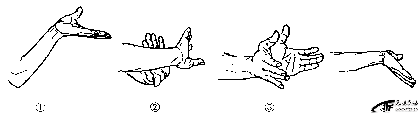 是指八卦掌练习时手的运动方法。主要掌法有①穿掌:后掌掌心向上,掌指向前,从前掌下穿出的动作(图2—4—71—①);②蹋掌:以掌根为力点,自上而下,向前下方或向身体侧方击掌的动作(图2—4—71—②);③撞掌:双掌根靠紧,掌心朝前,以掌根为力点,向前撞击的动作(图2—4—71—③);④掖掌:掌心朝前,掌指朝下,以掌根掌心为力点,向前下击出的动作(图2—4—71—④)。另外还有扣掌、螺旋掌、托掌、抄掌、拍掌等。