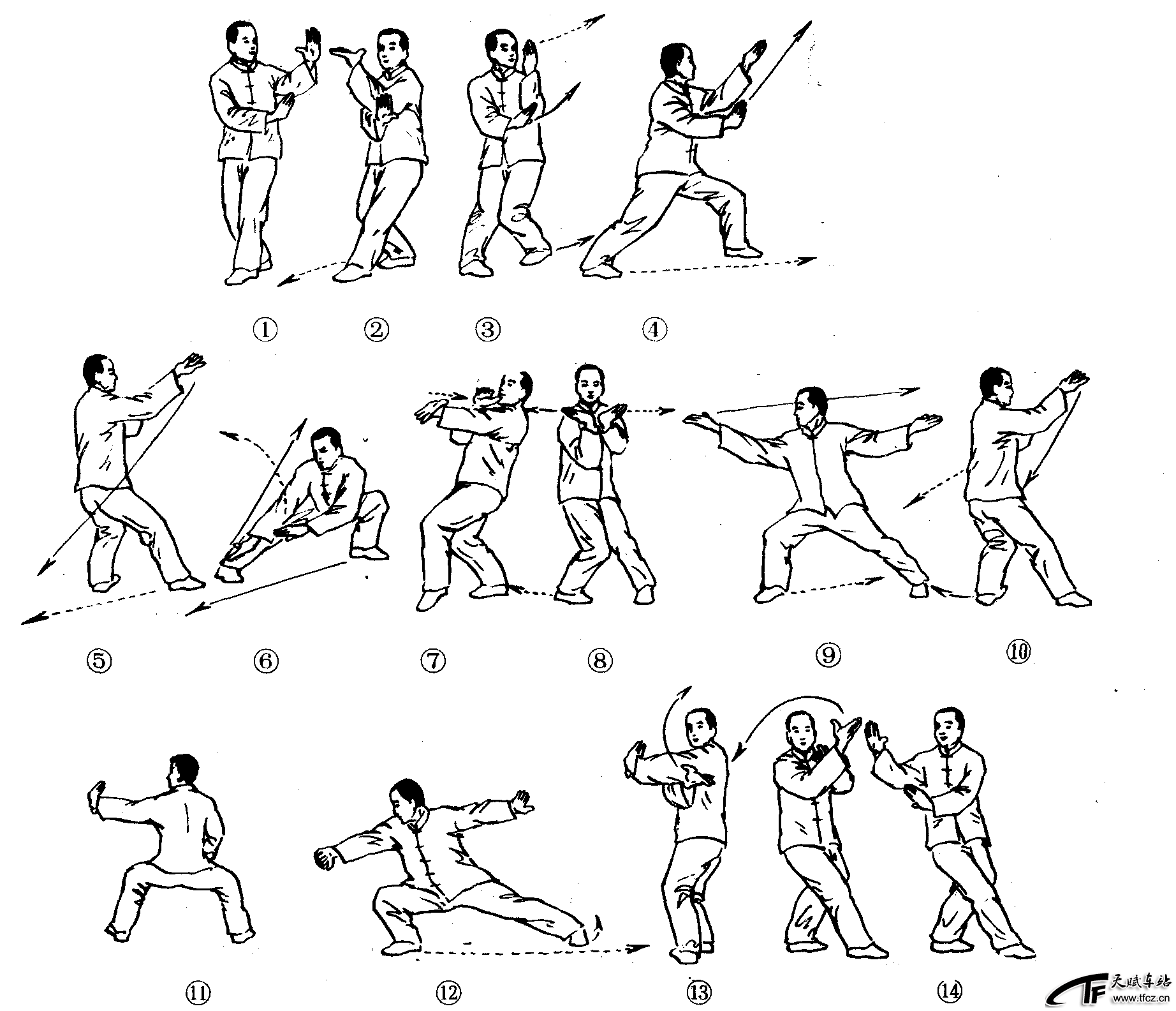 八卦掌的八大掌法之一。动作过程:①青龙探爪:左势青龙探爪。(图2—4—76—①)②云片切掌:左脚进步同时,左掌掌心翻转朝上,以肘为轴,经左向前在额前上方片旋一周,至左前方掌指向前,目视左掌。(图2—4—76—②)③背身吐信:右脚进步扣脚成八字步,同时向左转体;右掌不动;左掌收至左肩旁;眼看左后方。(图2—4—76—③)身体继续向左转,左足向左横进一步,身体前移成左弓步,同时,左掌掌指朝前,掌心向上向前穿掌,高与肩齐,右掌推至左肘下。(图2—4—76—④)④青龙出水:右脚向前上步,成右虚步;同时右掌向外翻转,经左臂下向前穿掌;左掌内翻掌心向下收至右肘下。(图2—4—76—⑤ ......