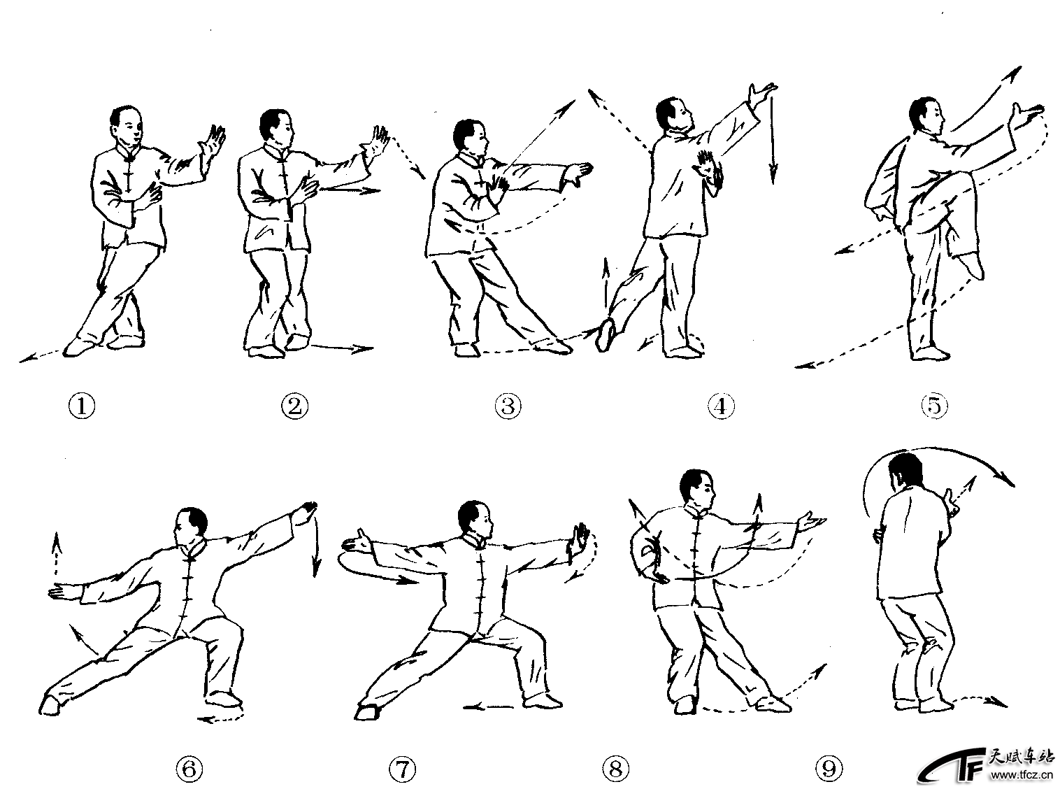 八卦掌的八大掌法之一。动作过程:①青龙探爪:左势青龙探爪。(图2—4—78—①)②青龙回头:右脚向前进步,扣脚成青成回头。(图2—4—78—②)③野马回槽:上体左转,左脚向前进步;同时左小臂向内翻转,掌心向外平推;右掌向前推至左肘下方;目视前方成野马回槽。(图2—4—78—③)④宿鸟入林:身体前移,右脚向前进半步,同时左掌心向下收至右腋下;右掌心向上向前上方穿掌;目视右掌成宿鸟入林。(图2—4—78—④)⑤白蛇吐信:右脚以脚跟为轴,向内扣转;左腿屈膝提起,同时左掌由右腋下经胸前颏下,掌心向前上方推托,左肘正对左膝,右臂随身体转动内旋翻转掌心,向右胯外侧下按掌,目视左 ......