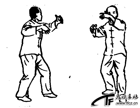 大成拳的主要桩功之一。动作规格:由立正姿势开始,右脚不动,右膝微屈并内扣;左脚顺脚尖方向向前迈约一脚远,以前脚掌着地,脚跟略抬起,膝微屈;上体直立,稍右转;直腰,微含胸;左臂曲肘成弧形抱于左胸前上方,手腕与鼻相对;右臂曲肘成弧形抱于右胸前,手与胸高;两手均为基本手型,头上顶,下腭微收,眼睛通过右手腕向前平视。(图2—4—83)此为左式技击桩。右式技击桩为右手、右腿在前,姿势与左势相同。动作要领:上体正直并微向左后方靠(右式向右后方靠);两大臂要抬起,两小臂要向外撑;后腿髋关节要微内收,膝关节微内扣;前腿膝关节要向前顶。意念:技击桩的意念内容很多,主 ......