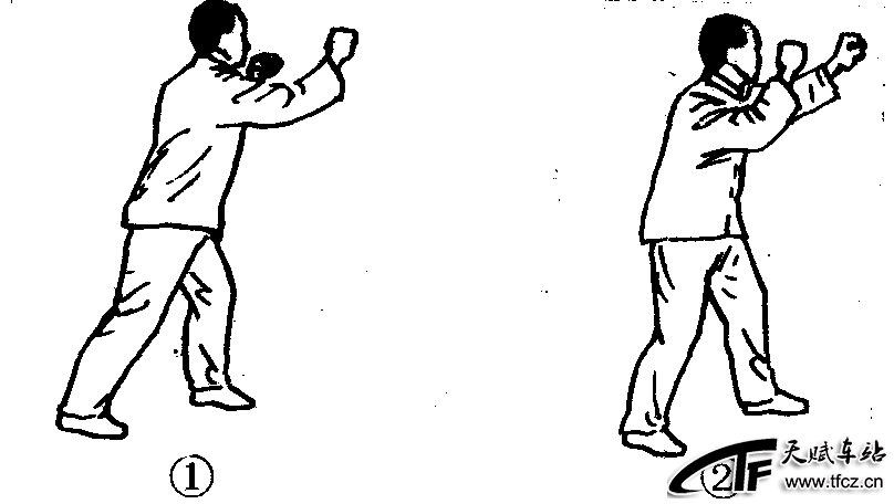 大成拳的基本拳法之一。为左右拳向前上击打的动作。炮拳试力使双拳沿身体前面的三个假设圆圈路线连续慢速练习,一个是在身体正中线上与矢状面平行的圈,为进攻圈;另外两个圈在身体左右两侧与身体额状面平行,为防守圈。炮拳发力则是一拳或两拳沿直线向前快速击出。预备式为左技击桩。动作过程:右炮拳:右腿蹬地使身体重心移至前脚,同时上体稍左转,右拳沿进攻圈,左拳沿左侧防守防圈同时出击,各划一圈后还原成左技击桩;头稍右侧,目斜视前方。(图2—4—87—①)左炮拳:左腿将身体重心向后蹬移至右脚内侧,上体随之右倾,同时左拳沿进攻圈,右拳沿右侧防守圈同时出击,各划 ......