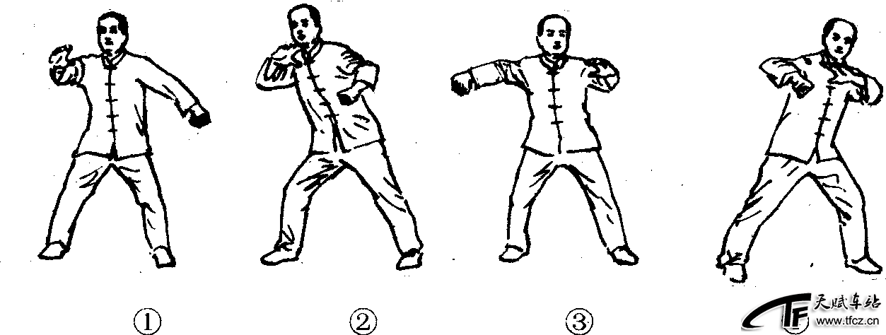 大成拳的基本拳法之一。为横向击打的动作。动作过程:预备式:两脚开立;上体正直;两臂屈肘在身体两侧抬起,右手成掌高与肩平或低于肩,左手握拳与腰平或高于腰,目向前平视。(图2—4—88—①)左圈捶:左腿蹬地,拧腰使身体向右转,重心移至右脚,左拳同时随身体转动向右平击,右手用掌向左回压,左拳从右掌下打出;头略右侧,目斜视打击方向。(图2—4—88—②)右圈捶:左圈捶的上体自然转正,两臂自然松开,左手成掌,右手成拳(图2—4—88—③);然后上体向左拧转,身体重心移至左脚;同时右拳随身体转动向左平击,右掌向左回压,使左拳从右掌下打出;头略左侧、目斜视打击方向。(图2-4-88 ......