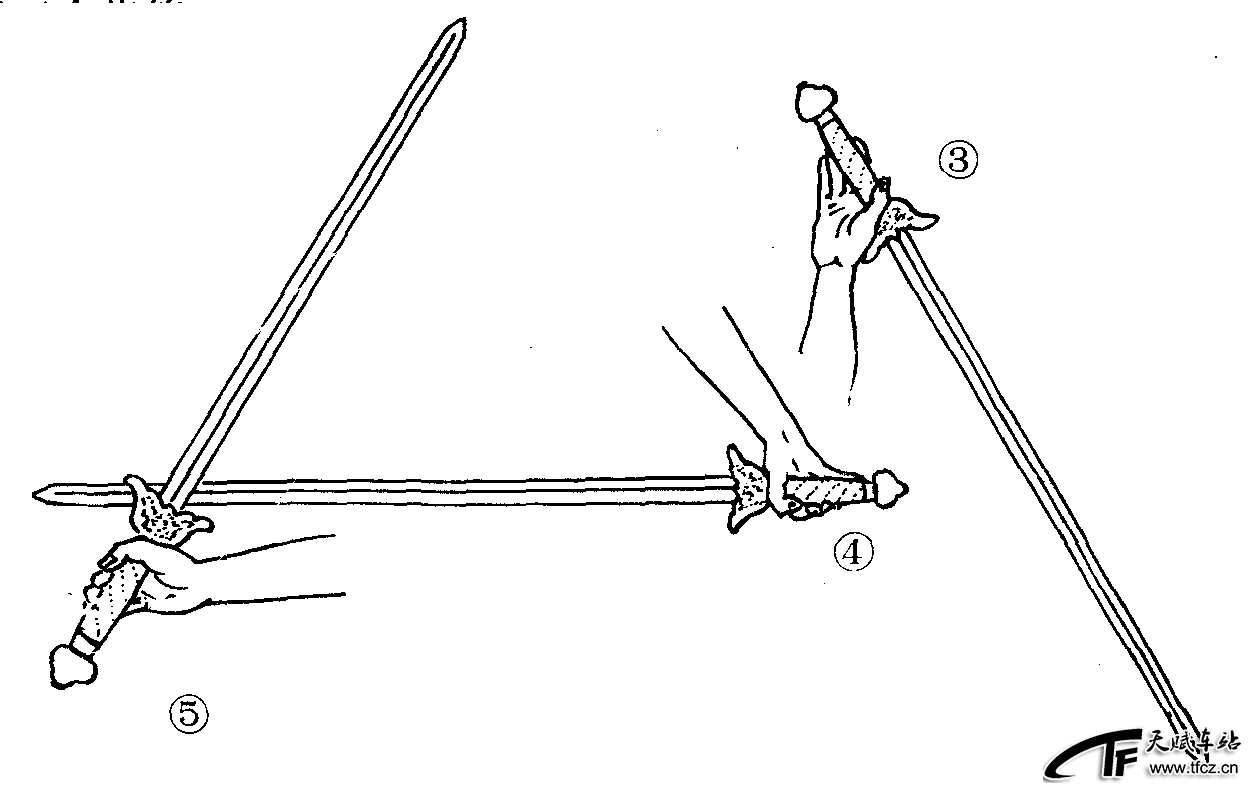 又称握把。根据不同剑法的需要,右手持剑有5种形式:①满把:右手靠紧剑格,虎口张开,四指靠拢并齐握住剑柄,拇指压在食指第2指关节上。(图2—4—94—①)做崩剑、提剑等剑法时多用此种握法。②螺把:右手靠近剑格,四指依序斜向卷屈握剑柄,呈螺形,拇指靠于食指第3指骨,腕关节微下屈。(图2—4—94—②)此种握法应用最广,做劈、刺、点等许多剑法时都用此握法。③压把:右手先满把握剑柄,再松开小拇指和无名指,并用无名指第1指节和小拇指压于剑柄后端上面,使剑身横平,剑尖不下坠。(图2—4—94—③)做挂剑时用此握法。④钳把:用右手食指、拇指和虎口的挟持之劲将剑柄钳住,其 ......