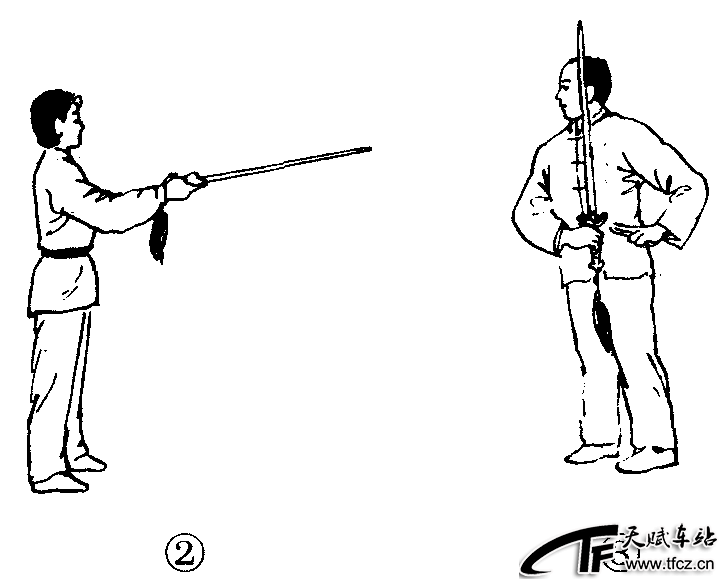 剑法之一。是右手持剑于胸,左手剑指放于剑柄一侧的动作。在传统剑法中,左手成掌附于剑柄,并不实抱。现代剑术套路中抱剑出现的次数较少。动作过程:抱剑有剑尖向右成立剑的横抱剑(图2—4—113—①)、剑尖向前成平剑的平抱剑(图2—4—113—②)、剑尖向上的立抱剑(图2—4—113—③)等形式。动作要领:剑与胸同高,左手成剑指平抱剑,掌心向上;立抱剑和横抱剑手心向里。攻防含义:抱剑是防中待攻的剑法。是双手用剑的准备动作。
