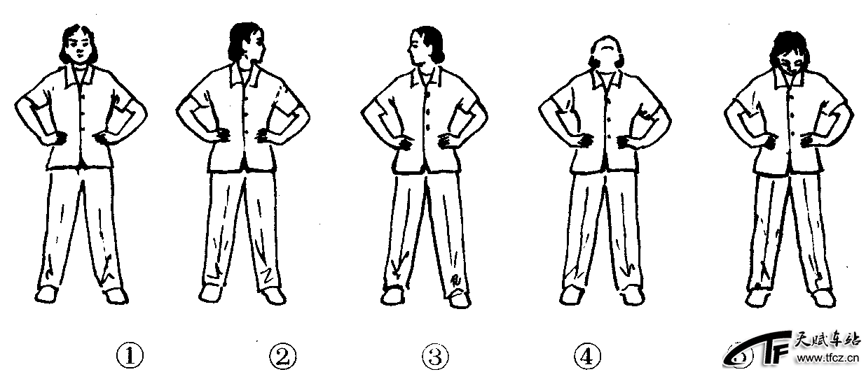 练功十八法第1套第1节。主要是通过头部的活动使颈部疾病得以缓解。动作过程:两腿分立,稍宽于肩,两手叉腰,拇指朝后。(图2—4—122—①)①头颈正直向左旋转至最大幅度。(图2—4—122—②)②还原成预备姿势。③头颈向右旋转至最大幅度。(图2—4—122—③)④还原成预备姿势。⑤抬头看天。(图2—4—122—④)⑥还原成预备姿势。⑦低头看地,下颌尽量接触胸骨。(图2—4—122—⑤)上述动作共做4个8拍。注意事项:练习时要保持上体正直,不能挺腹。颈部肌肉以产生酸胀感为度。此功法对颈部急性扭伤,慢性颈部软组织疾病都具有一定的疗效。