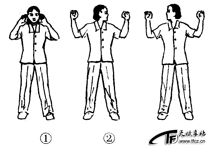 练功十八法第1套第2节。动作过程:两脚分立,稍宽于肩,两臂屈肘,两手虎口相对成圆形,掌心向前,手距面部30厘米,目视前方。(图2—4—123—①)①两手左右分开至体侧,同时手掌变空拳,拳心向前,头向左转。(图2—4—123—②)②还原成预备姿势。③两手左右分开至体侧同时手掌变空拳,拳心向前,头向右转。(图2—4—123—③)④还原成预备姿势。上述动作共做4个8拍。注意事项,分手时不能耸肩,肩胛骨尽量向脊柱靠拢,两肘须保持在同一水平。此练习对颈、肩、背部酸痛、强直及胸闷有一定疗效。