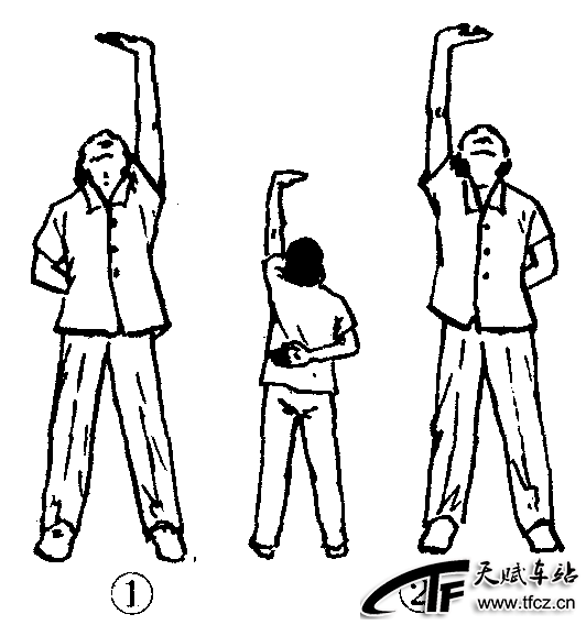 练功十八法第1套第6节。动作过程:两脚分立,略宽于肩。①左臂经体侧上举成托掌,眼始终看左手背,同时右臂屈肘,手背紧贴左腰后部。(图2—4—126—①)②左臂仍经体侧下落还原成预备姿势。③④动作与①②相同,换右臂做。(图2—4—126—②)共做4个8拍。注意事项:上举时上体要保持正直,手臂伸直,眼随手动。此功法对肩关节僵直,颈肩、腰痛及胃脘胀满都有一定疗效。