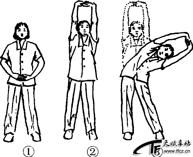 练功十八法第2套第1节。动作过程:两腿分立,略宽于肩,手指交叉于腹前,掌心向上。(图2—4—127—①)①两臂上提至脸前翻掌上托,掌心向上,抬头挺胸。(图2—4—127—②)②两臂带动上体向左侧屈一次。(图2—4—127—③)③再侧屈1次。④两臂经体侧下落还原。⑤~⑧动作与①~④相同,但方向相反。共做2~4个8拍。注意事项:反掌上托时,上体正直,手臂伸直;体侧屈时,髋关节不要移动。此功法对腰僵直,脊柱活动不便侧弯有一定疗效。