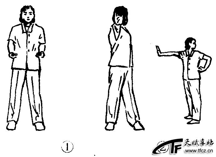 练功十八法第2套第2节。动作过程:两脚分立,略宽于肩,双手抱拳于腰间。(图2—4—128—①)①右手立掌向前推出,同时上体向左转90°,掌心向前,眼看左后方,左肘伸向左后方,拳头顶于腰部,两臂成直线。(图2—4—128—②)②还原成预备姿势。③④动作与①②相同,但方向相反。共做4个8拍。注意事项:推掌时用内劲慢推;转腰时上体要正直,两腿要伸直,两臂相对成直线。此功法对肩、背和腰的软组织劳损有一定疗效。