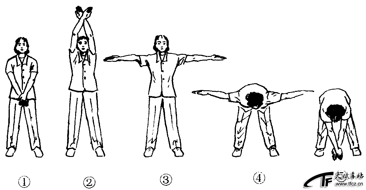 练功十八法第2套第4节。动作过程:两脚分立,略宽于肩,两手在体前交叉,掌心向内。(图2—4—130—①)①两臂上举,挺胸抬头,收腹,眼视手背。(图2—4—130—②)②两臂经体侧下落至侧平举,掌心向上。(图2—4—130—③)③两手翻掌,同时上体挺腰前屈。(图2—4—130—④)④两臂体前交叉。(图2—4—130—⑤)⑤两臂紧贴两耳,上体挺腰伸直成①势。⑥~⑧动作同②~④一样,最后一拍还原成预备姿势。共做4个8拍。注意事项:上体挺腰前屈或伸直时,要“挺腰”,以增加腰部活动;上体前屈时两膝不得弯曲,两手尽量触地。此功法对颈、背及腰部酸痛有较好的治疗效果。