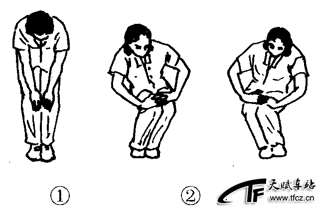 练功十八法第3套第1节。动作过程:上体前屈,两手扶膝。(图2—4—133—①)①两腿屈膝半蹲,向顺时针方向绕环一周。(图2—4—133—②)②腿绕后时伸直,并还原成预备姿势。共做2~4个八拍。注意事项:两膝绕环时幅度要大,动作不要过快,脚跟不得离地。要先顺时针方向做2个8拍,再做逆时针方向2个8拍。此功法对于膝、踝关节酸痛有一定的治疗效果。