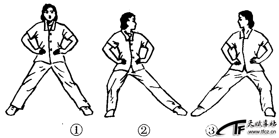 练功十八法第3套第2节。动作过程:两脚分立一大步,双手叉腰,拇指向后。(图2—4—134—①)①右腿成仆步,同时上体向左转约45°。(图2—4—134—②)②还原成开始预备姿势。③④动作与①②相同,但方向相反。(图2—4—134—③)共做4个8拍。注意事项:做仆步时上体保持正直。此功法对腰、臀、腿痛以及髋、膝关节活动不便都有一定的治疗效果。