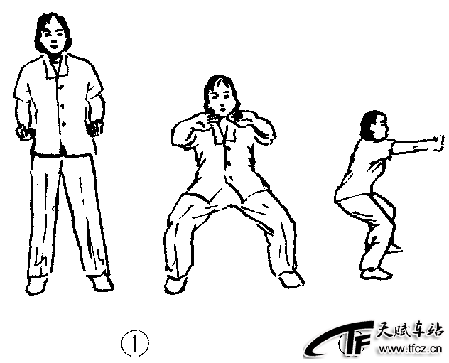 练功十八法第4套第1节。动作过程:两脚分立,略宽于肩,两手推掌收于腰部。(图2—4—139—①)①两腿分开成马步,同时两臂内旋向前推掌(掌心朝前,指尖相对)。(图2—4—139—②)②还原成预备姿势。共练4个8拍。注意事项:向前推掌时要尽量向内翻腕,两臂伸直。此功法对四肢和膝关节酸痛有较好的治疗效果。