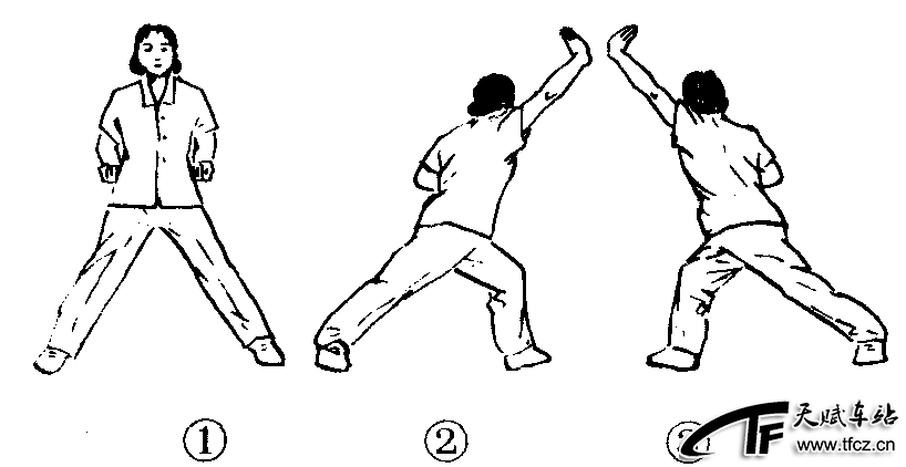 练功十八法第4套第4节。动作过程:两腿直立,两手握拳于腰间,然后分开一大步。(图2—4—142—①)身体向左后转体成左弓步,目视左肩,同时右手向前上方推掌,右臂与右腿成一直线。(图2—4—142—②)②还原成预备姿势。③~④动作与①~②相同,方向相反。(图2—4—142—③)共做4个8拍。注意事项:上体左转时以左脚跟为轴,右脚不动。弓步时后脚脚跟不得离地,此功法对四肢关节及肩、腰、腿酸痛有一定治疗效果。