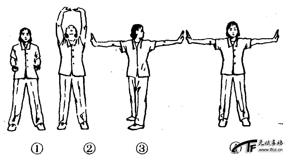 练功十八法第5套第1节。动作过程:两脚分立,略宽于肩,两手握拳收于腰间。(图2—4—144—①)①两拳变掌,翻掌上托,指尖相对,目视手背。(图2—4—144—②)②还原成预备抱拳。③两手向前后推掌,同时上体左转90°,目视左手。(图2—4—144—③)④还原成预备抱拳。⑤同③动作一样,但方向相反。⑥还原成预备抱拳。⑦两手向体侧推掌,掌心向外。(图2—4—144—④)⑧还原成预备抱拳。共做4个8拍。注意事项:转体时两脚不要转动。此功对网球肘,腕、指腱鞘炎及肩、腰酸痛有一定的治疗效果。