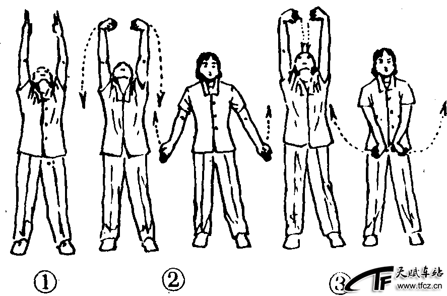 练功十八法第5套第3节。动作过程:两脚分立,略宽于肩,两手握拳收于腰间。①两拳变掌屈臂上举,掌心相对,抬头看天。(图2—4—146—①)②两手握拳,两臂经体侧下落成预备姿势。(图2—4—146—②)做1~2个8拍③两拳变掌,两臂向下伸,掌心向外,翻腕再经体侧上举。(图2—4—146—③)④两掌变拳屈腕,使拳背相对,屈臂,经体前下落并还原成预备姿势。共做2个8拍。注意事项:两手上举时要抬头挺胸,练功次数也可以根据需要来定。此功对漏肩疯、网球肘、腕指腱鞘炎具有一定的治疗效果。