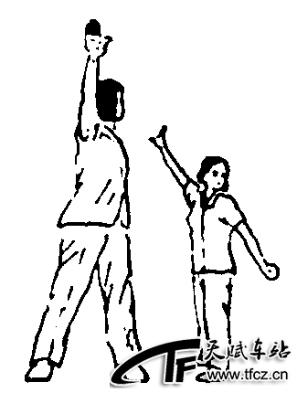 练功十八法第5套第4节。动作过程:两脚分立,略宽于肩,两手握拳收于腰间。①右拳变掌向斜上方推出,同时左拳内转后伸,拳心向上,目视左拳。(图2—4—147)②还原成预备姿势。③④动作同①②相同,但方向相反。共做4个8拍。注意事项:两臂上下要成一条直线,肩要放松。此功法除对漏肩疯、网球肘等有一定疗效外,还能防治腰背酸痛。
