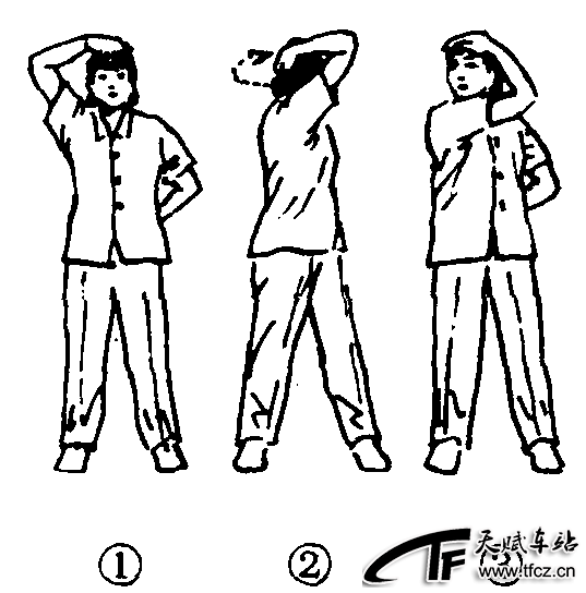 练功十八法第6套第3节。动作过程:两脚分立,略宽于肩。①右掌根紧贴头顶,四指向前,同时屈左臂手背贴腰后。(图2—4—152—①)②右掌沿头颅中线往后梳至枕骨,同时向左转体。(图2—4—152—②)③右掌根转向前,经头右侧至左侧太阳穴,上体还原,头向右转。(图2—4—152—③)④还原成预备姿势。⑤~⑧同①~④动作相同,但方向相反。共做4个8拍。练习时要动作缓慢、连贯。此功法对头晕、眼花、失眠、心悸等有一定的疗效。