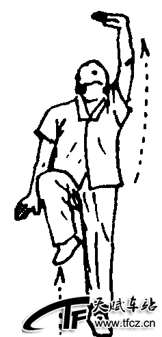 练功十八法第6套第4节。动作过程:两脚并立,两手抱拳收于腰间。①重心移至右脚,左臂上举并翻掌上托,目视手背。右拳变掌下按,同时提右膝。(图2—4—153)②还原成预备姿势。③④动作同①②—样,但方向相反。注意事项:提膝时上体要保持正直,两臂尽力拉伸。此功法对于脾胃虚弱、消化不良者有一定治疗效果。