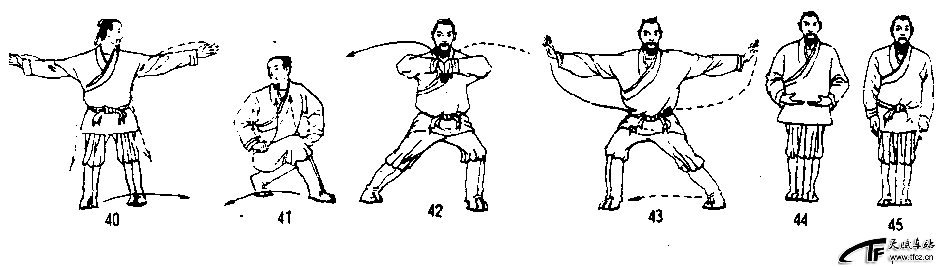 舒心平血功动作之七。8拍动作:①随着吸气,提肛调裆,右腿屈膝半蹲,左脚向左开步,随之重心向左脚移动;同时两臂内旋两掌分别向两侧反臂托掌,当接近水平时臂外旋使掌心朝前,臂自然伸直;眼看左掌。(图40)②随着呼气,松腹松肛,身体稍向右转,右脚向左脚前盖步下蹲成盘根步;同时两掌向上经胸前下按,当按到腿侧时握拳,中冲点劳宫,拳心朝下,两臂成弧形;眼平视右前方。(图41)③随着吸气,提肛调裆,身体稍起,左脚跟落地,右脚向右开步;同时两拳变掌,掌背相靠叠腕经腹前上提至胸前,掌指朝下;眼平视前方。(图42)不停,身体重心移到右脚,右腿弯曲,左腿伸直;同时两掌由腕、掌 ......