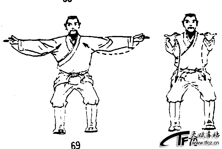 四十九式经络动功第一段“通经”动作之四:①两腿半蹲不动,两臂外旋使八字掌掌心朝上;同时眼看商阳。(图63)不停,两掌分别向左右略带弧形平摆,臂自然伸直,掌与肩同高。(图64)②两腿半蹲,以腕为轴,臂内旋,食指尖(右手顺时针方向,左手逆时针方向)向后旋转,肘微屈下沉。(图65)不停,两臂继续内旋,两食指顺式向里缠绕使掌心朝下,继而两臂自然伸直,食指向身后斜指。(图66)③两脚不动,仍屈膝半蹲,以腕为轴,臂外旋,右食指尖沿逆时针方向、左食指尖沿顺时针方向缠绕一周。(图67~68)不停,两臂伸直,掌心朝上,肘尖下垂,仿佛金龙左右盘玉柱,腾云驾雾遨太空。(图69)④两腿保 ......