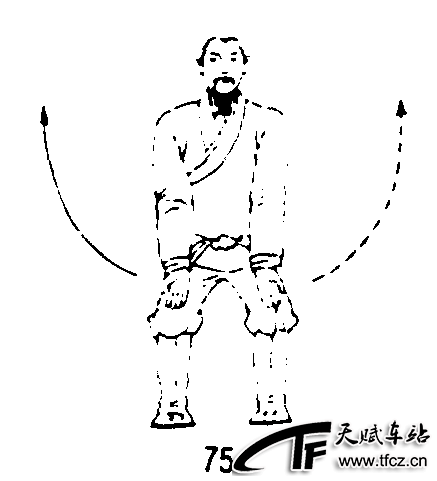 四十九式经络动功第1段“通经”动作之七:随着呼气(聚呼),松腹松肛,脚跟迅速震地,两腿半蹲;同时两腕放松向前,向下弧形抽打膝上6寸起肉处的伏兔穴;眼平视前方。(图75)练功次数:叶底藏花和擒捉伏兔二式连在一起各做3次。要点:重心尽量高提;吸气时细匀深长,呼气时轻吐“呬”音;两掌抽打伏兔穴要富有弹性,快速而准确。下接动作之八——怀中抱月,动作之九——商商相接 ......