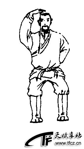 四十九式经络动功第2段“循行”动作之三(全套动作顺序第十三式):右臂内旋使掌心朝下,接着随身体左转,右掌向前、向左弧形平摆,臂自然伸直,肘尖下垂,当右掌摆到身体左侧时变成掌心朝后,继而随着身体右转逐渐变成掌心朝下;同时依次默念商阳、曲池、肩髃、迎香。(图85、86)不停,两腿半蹲,右掌心朝下随转体向右、向上弧形回带到头的右前方(或前方),臂稍屈,掌心朝下,掌指朝左;左掌仍贴于命门;眼平视前方。(图87)要求:呼吸自然,松腰敛臀,气沉丹田,右掌向左摆时要高于肘,记熟手阳明大肠经的循行部位及有关穴位 ......