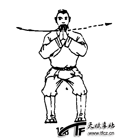 四十九式经络动功第3段“导气”动作之三(全套动作顺序第二十五式):两手从两颊合于面前,掌指朝上,中指端与鼻尖齐平,掌距面部约30厘米;同时两腿半蹲;意想着自己置身于一座苍松环抱,翠竹成林,祥光霭霭,云雾纷纷的古刹之中,整个身体就像霞光飘渺,香烟缭绕一样的飘浮着,飘向天边,飘向云层,飘向太空,飘向月宫。(图108)要求:下肢稳固,上体中正,松腰敛臀,两眼轻闭或平视 ......