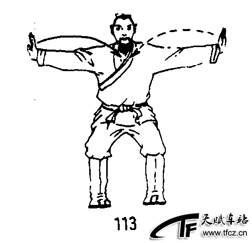 四十九式经络动功第3段“导气”动作之四(全套动作顺序第二十六式):①随着吸气,提肛调裆;两腿半蹲不动;同时两臂内旋两掌从小指依次相抵分开使掌心慢慢转向体侧时再推出,两臂伸直;眼看左掌。(图109)②随着呼气,松腹松肛;两腿半蹲不动;同时两掌从体侧合于面前成“童子拜佛”势;眼看指尖。(图110)③拍同①拍,唯向右转头做动作。(图111)④拍同②拍。(图112)⑤两脚仍不动,头亦不动,两掌同上再向左右推出。(图113)练功次数:“童子拜佛”和“左右推碑”连在一起各做3次,一拜一推为一次。要点:“童子拜佛”和“左右推碑”要连在一起进行;左右推碑应以意引气沿肺经循行至拇指和食指尖;由 ......