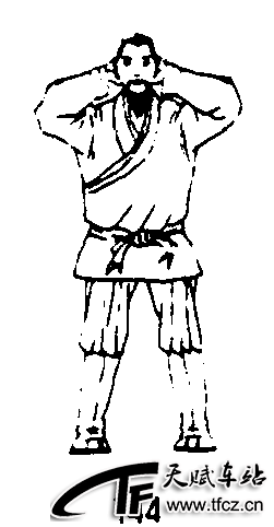 四十九式经络动功第3段“导气”动作之十一(全套动作顺序第三十三式):①随着吸气,提肛调裆;同时两臂外旋,两掌心紧贴脊柱两侧向上摩运至腋下,使掌背沿颈侧上行;眼平视前方。(图138、139)②随着呼气,松腹松肛;同时两臂内旋使掌指横置于脑后,掌指相对;眼平视前方。(图140)③随着吸气,提肛调裆;身体不动;同时头颈向左倾斜睡枕,左肘尖下拉,左掌心贴耳;右肘尖上提,右拇指腹按翳风穴,食指腹按风池穴。(图141)④随着呼气,松腹松肛;同时头颈竖直成正直姿势,两掌复还脑后;眼平视前方。(图142)⑤随着吸气,提肛调裆,身体不动;头颈向右侧倾斜睡枕,右肘尖下拉,掌心贴耳;左肘尖上提,左 ......