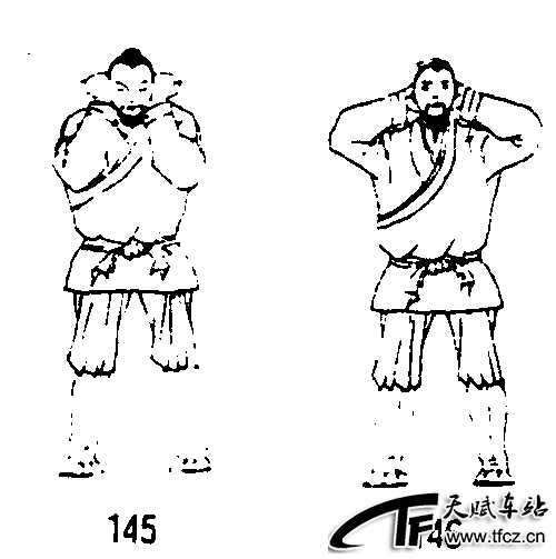 四十九式经络动功第3段“导气”动作之十二(全套动作顺序第三十四式):①头向下低垂,下颏触及胸骨;同时两肘内收使肘尖朝下,两掌心覆盖耳轮上部,指尖朝后(图145)。②将头竖直;同时两肘外张。两掌复还脑后;眼平视前方。(图146)要求:呼吸自然,低头不躬身;其他与“左右睡枕”的要点相同 ......