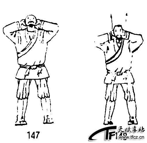 四十九式经络动功第3段“导气”动作之十三(全套动作顺序第三十五式):①随着吸气,提肛调裆;同时头颈尽量向后仰,下颏向上牵拉,手指托于脑后。(图147)②随着呼气,松腹松肛;头颈竖直,两掌复还脑后;眼平视前方。(图148)要点:仰头不仰体,其他与“左右睡枕”动作的要点相同 ......