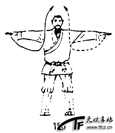 四十九式经络动功第3段“导气”动作之十四(全套动作顺序第三十六式):①随着吸气,提肛调裆;脚跟提起,两掌心朝上从脑后托起,臂自然伸直,掌指相对;眼平视前方。(图149)②随着呼气,松腹松肛;同时脚跟落地,两腿伸直,两掌向身体侧前方下落;眼平视前方。(图150)要点:提肛与松肛要与呼吸紧密结合;两掌上托时将气导入十指,下按时将气沉入丹田或涌泉 ......