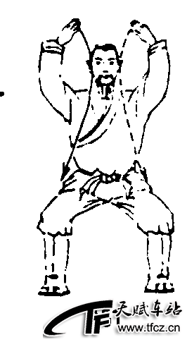 四十九式经络动功第3段“导气”动作之十五(全套动作顺序第三十七式):两腿下蹲;同时两掌继续向下、向身前、向上划弧停于头顶前上方,掌心朝下斜朝内,掌指朝内斜朝后;两眼轻闭或平视前方;意想着日月精华之气从百会贯入丹田,沉至会阴,分左右两支下行达涌泉;再自涌泉提气,上行会于会阴,经尾闾、夹脊达百会。(图151)下接动作十六——气导涌泉,动作十七——怀中抱月,动作十八——商商相接,动作十九——气沉丹田 ......