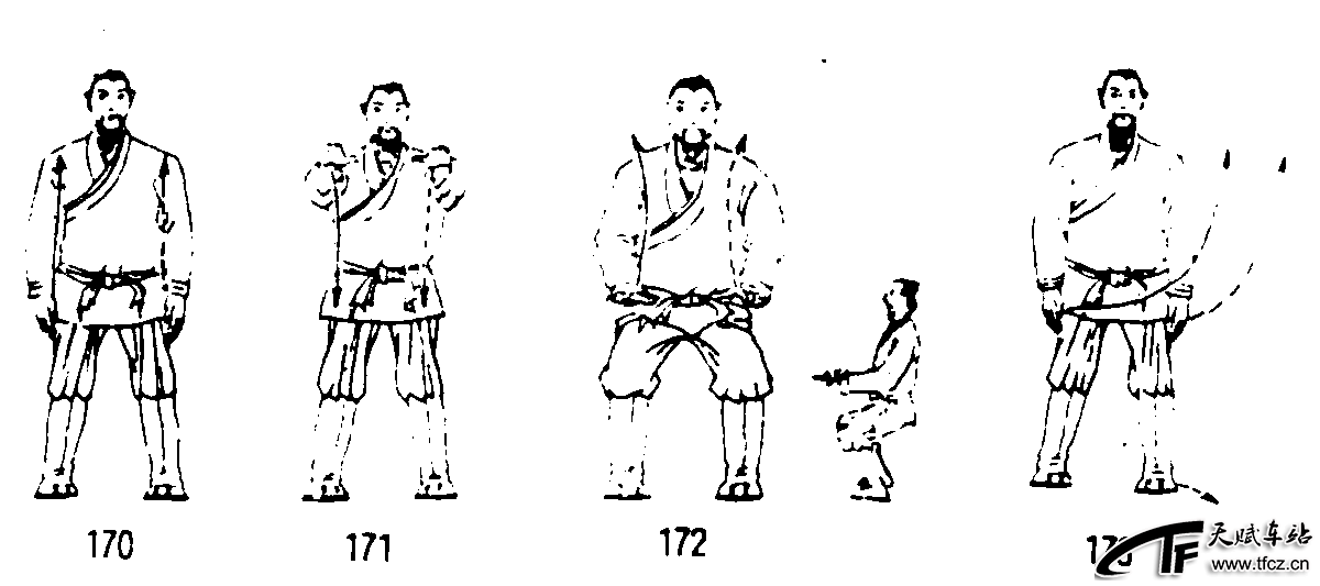 导引保健功动作之一。8拍动作:预备势:两脚开立与肩同宽,脚尖朝前,两掌垂于体侧;眼平视前方。(图170)①随着吸气,提肛调裆;同时两掌徐缓向前、向上摆起,高与肩平,宽与肩同,掌心朝下,两臂自然伸直;眼平视前方。(图171)②随着呼气,松腹松肛;同时两腿屈膝半蹲,两掌轻轻下按至腹前,掌心朝下,掌指朝前,两肘尖下垂;眼平视前方。(图172)③⑤⑦拍同①拍,④⑥⑧拍同②拍。练功次数:做两个8拍。第2个8拍的第⑧拍两腿伸直,两掌垂于体侧;眼平视前方。(图173)要点:两掌向前、向上摆起时要沉肩垂肘,切勿挺胸挺腹;两腿下蹲时要松腰敛臀,两肘要下沉稍回收;气沉丹田 ......
